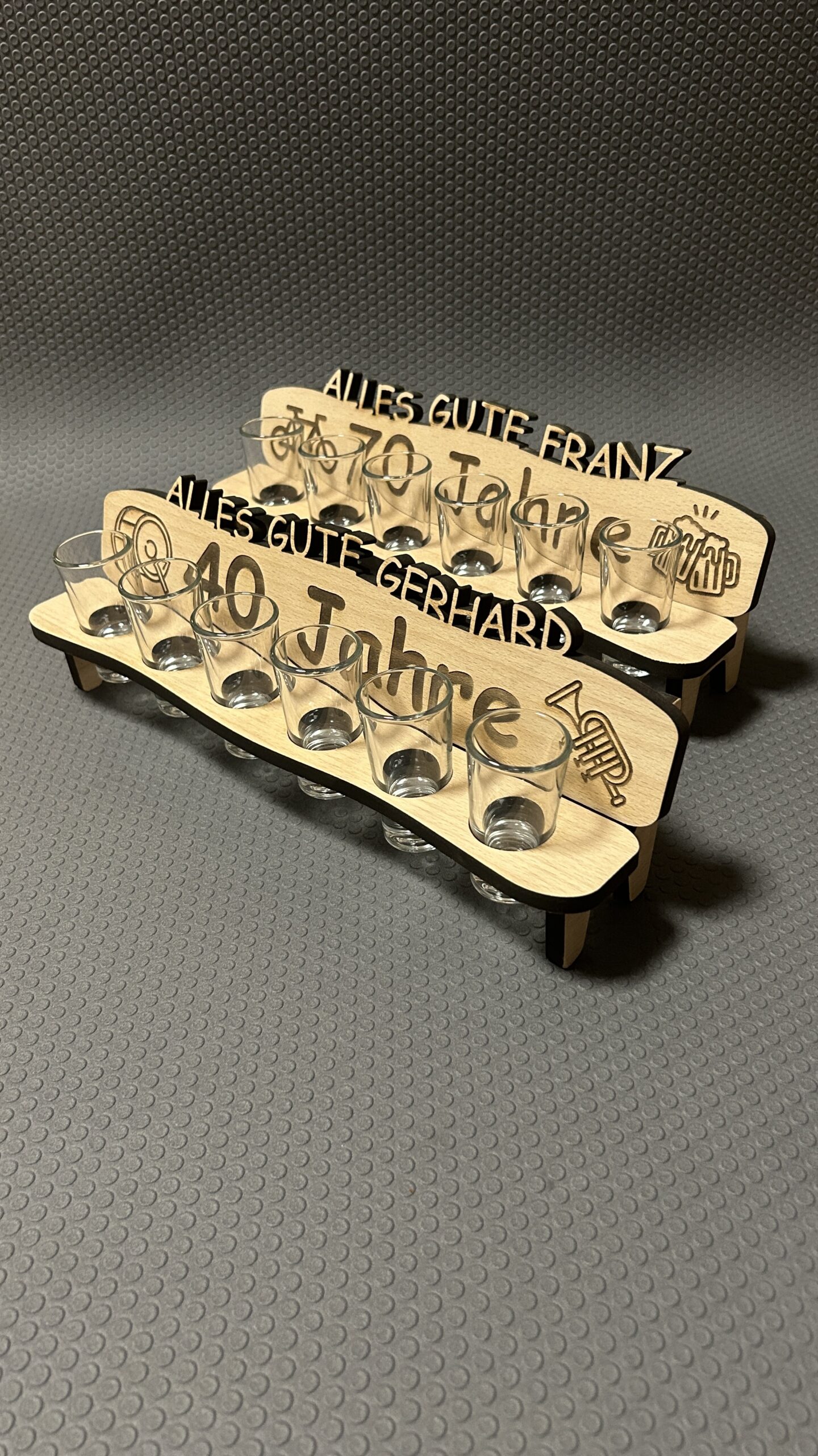 Personalisierbare Schnapsbank aus Holz mit Gravur. Hergestellt in Österreich